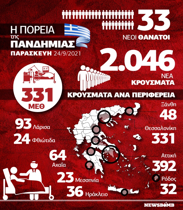 Πιο συγκεκριμένα, τα νέα εργαστηριακά επιβεβαιωμένα κρούσματα της νόσου που καταγράφηκαν τις τελευταίες 24 ώρες είναι 2.046.