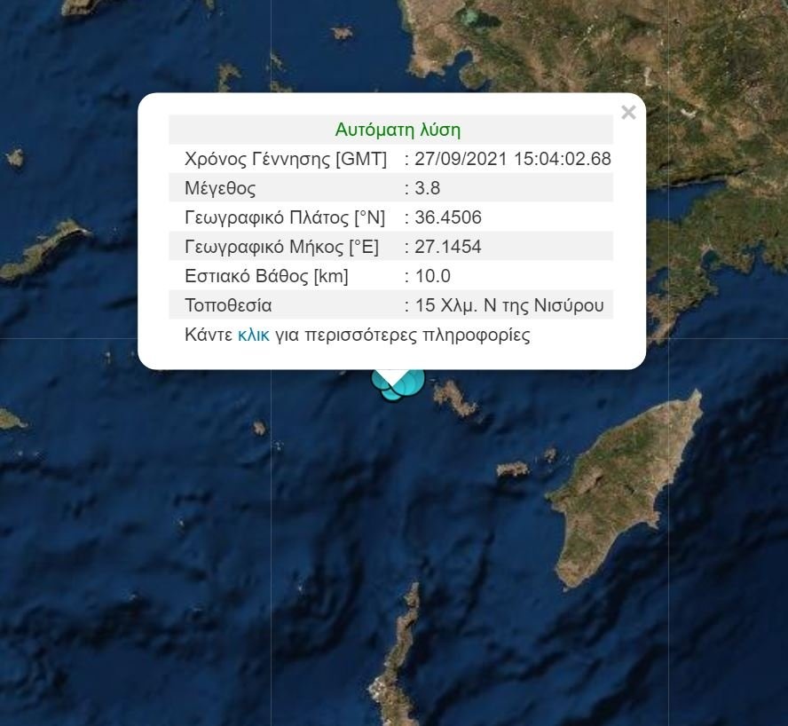 Σεισμική δόνηση καταγράφηκε πριν από λίγο στη Νίσυρο. Σύμφωνα με την Αυτόματη Λύση του Γεωδυναμικού Ινστιτούτου Αθηνών ο σεισμός είχε μέγεθος 3,9 Ρίχτερ.