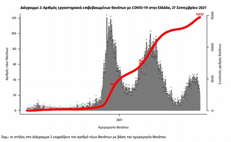 Οι νέοι θάνατοι ασθενών με COVID-19 είναι 47, ενώ από την έναρξη της επιδημίας έχουν καταγραφεί συνολικά 14.727 θάνατοι. Το 95,4% είχε υποκείμενο νόσημα ή/και ηλικία 70 ετών και άνω.