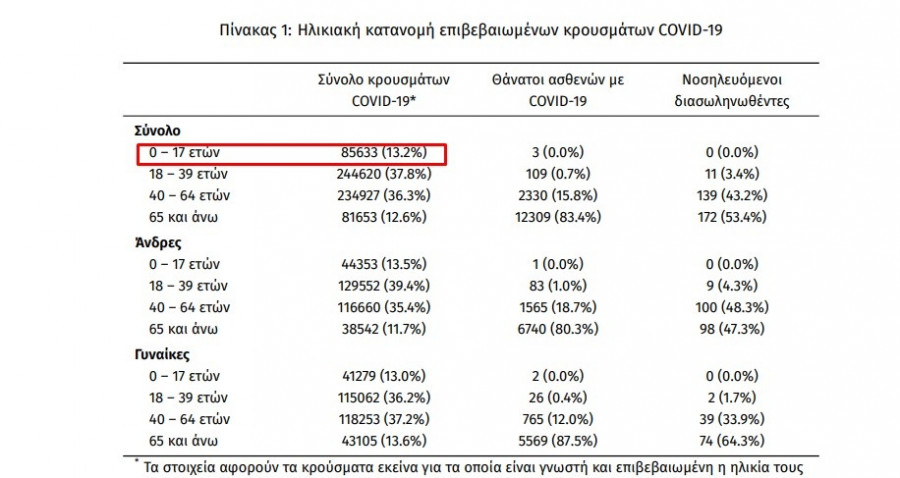 Μάλιστα, ο συνολικός αριθμός κρουσμάτων κορονοϊού σε παιδιά και εφήβους από την έναρξη της πανδημίας ανέρχεται σήμερα σε 85.633 περιστατικά.