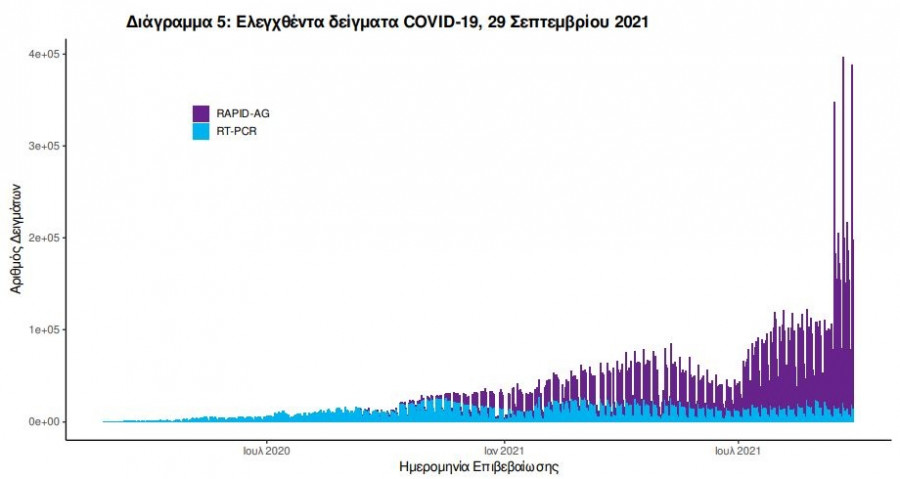 Στις 28 Σεπτεμβρίου 2021, πραγματοποιήθηκαν 166 δράσεις δειγματοληπτικών ελέγχων από τις Κινητές Ομάδες Υγείας (ΚΟΜΥ) του ΕΟΔΥ, στις οποίες διενεργήθηκαν 16.798 έλεγχοι Rapid Ag και ανευρέθηκαν 314 θετικά (1.87%).