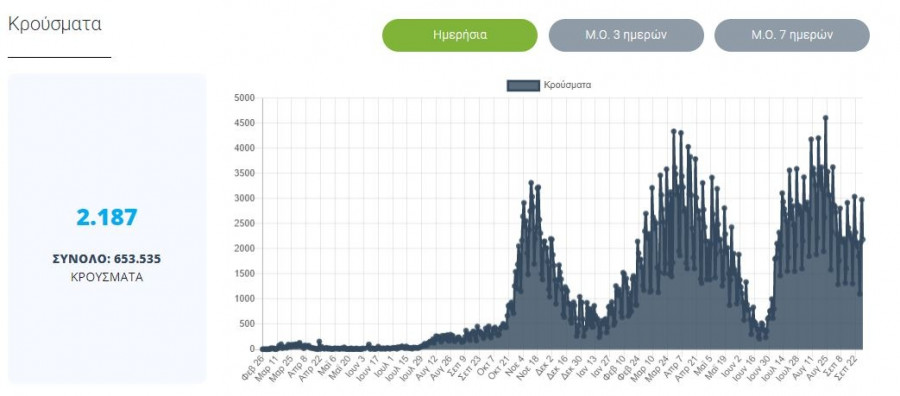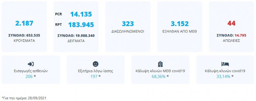 Με βάση τα δεδομένα που έχουν δηλωθεί στον ΕΟΔΥ και καταγραφεί μέχρι τις 29 Σεπτεμβρίου 2021 (ώρα 15:00), τα νέα εργαστηριακά επιβεβαιωμένα κρούσματα της νόσου που καταγράφηκαν τις τελευταίες 24 ώρες είναι 2.187, εκ των οποίων 4 εντοπίστηκαν κατόπιν ελέγχων στις πύλες εισόδου της χώρας.