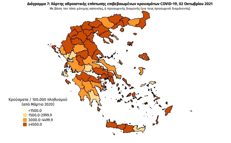 Ο χάρτης αποτυπώνει τη γεωγραφική κατανομή των συνολικών κρουσμάτων COVID-19 (από την αρχή της επιδημίας) ανά Περιφερειακή Ενότητα της χώρας, με βάση την δηλωθείσα διεύθυνση μόνιμης κατοικίας του ασθενούς, ή τη διεύθυνση προσωρινής διαμονής για τους τουρίστες και άλλους προσωρινά διαμένοντες στην Ελλάδα. Συμπεριλαμβάνονται τόσο κρούσματα με ιστορικό ταξιδίου (“εισαγόμενα”) όσο και κρούσματα με πιθανή εγχώρια μετάδοση.