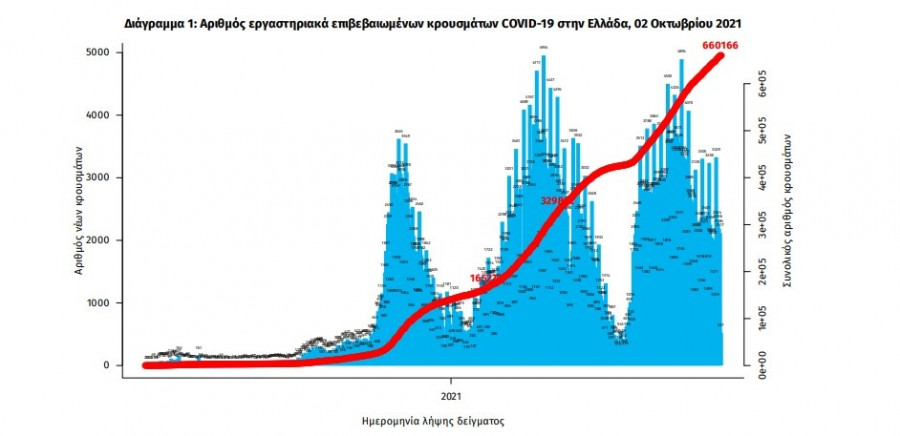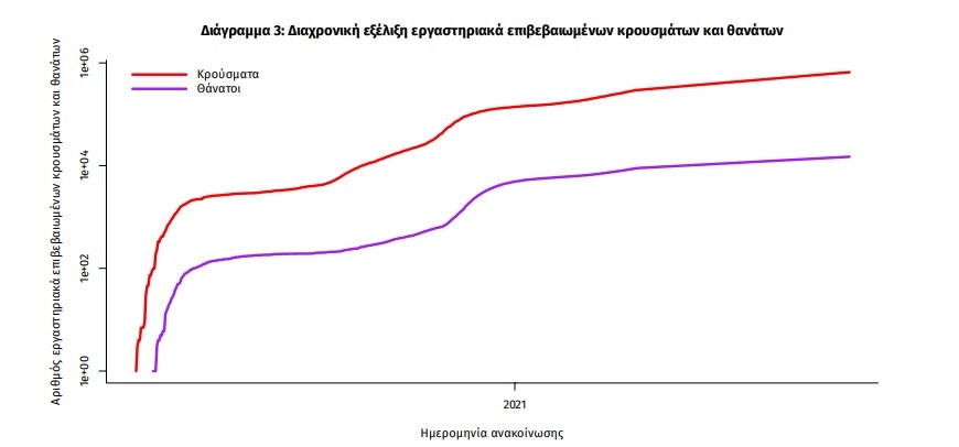 Η διαχρονική εξέλιξη των συνολικών κρουσμάτων και συνολικού αριθμού των θανάτων ασθενών COVID-19 παρουσιάζεται στο ακόλουθο διάγραμμα.