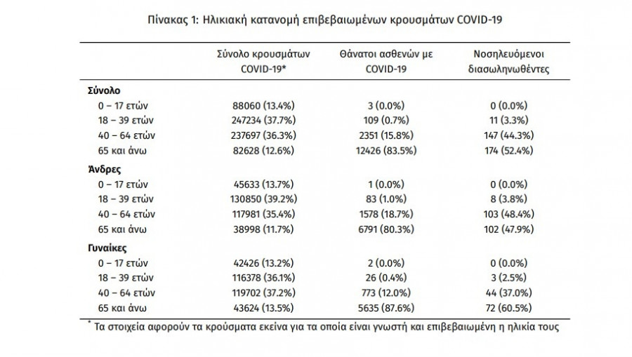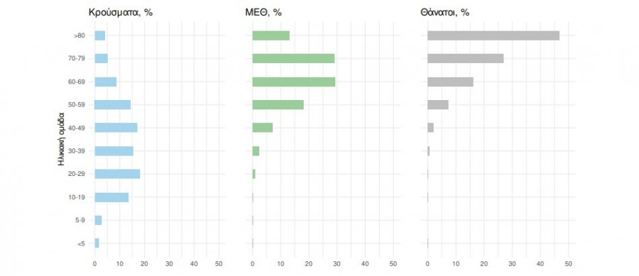 H ηλικιακή κατανομή των συνολικών κρουσμάτων, των περιστατικών που κατέληξαν σε θάνατο και των ασθενών που νοσηλεύονται διασωληνωμένοι.