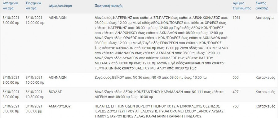 Διακοπή ρεύματος έχει προγραμματίσει για σήμερα, Κυριακή 3 Οκτωβρίου, ο ΔΕΔΔΗΕ, σε αρκετές περιοχές της Αττικής, στις οποίες περιλαμβάνονται η Aθήνα, το Γαλάτσι, η Βούλα και το Μαρούσι.