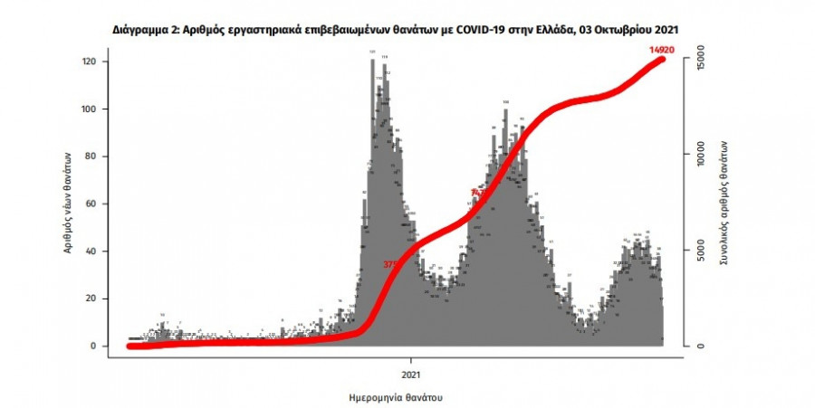 Οι νέοι θάνατοι ασθενών με COVID-19 είναι 31, ενώ από την έναρξη της επιδημίας έχουν καταγραφεί συνολικά 14.920 θάνατοι. Το 95.4% είχε υποκείμενο νόσημα ή/και ηλικία 70 ετών και άνω.