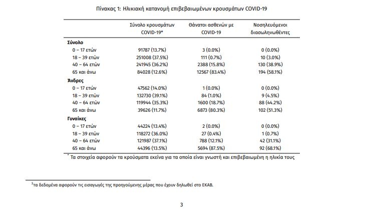 Η διάμεση ηλικία τους είναι 67 έτη. To 80.5% έχει υποκείμενο νόσημα ή/και ηλικία 70 ετών και άνω. Μεταξύ των ασθενών που νοσηλεύονται διασωληνωμένοι, 288 (86.23%) είναι ανεμβολίαστοι ή μερικώς εμβολιασμένοι και 46 (13.77%) είναι πλήρως εμβολιασμένοι. Από την αρχή της πανδημίας έχουν εξέλθει από τις ΜΕΘ 3.202 ασθενείς. Οι εισαγωγές νέων ασθενών Covid-19 στα νοσοκομεία της επικράτειας είναι 185 (ημερήσια μεταβολή -10.19%).