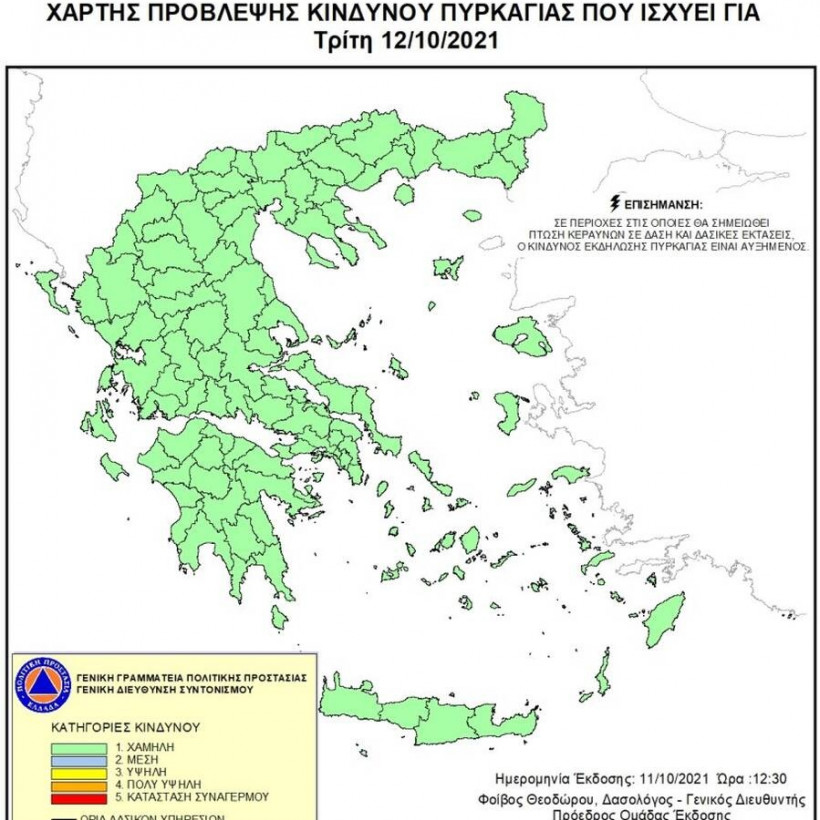 Φωτιές στην Ελλάδα - Όλες οι ειδήσεις: Σύμφωνα με το Χάρτη Πρόβλεψης Κινδύνου Πυρκαγιάς που εκδίδει η Γενική Γραμματεία Πολιτικής Προστασίας του Υπουργείου Εσωτερικών και Διοικητικής Ανασυγκρότησης, για σήμερα Τρίτη 12 Οκτωβρίου, προβλέπεται χαμηλός κίνδυνος πυρκαγιάς (κατηγορία κινδύνου 2), σε όλη τη χώρα.