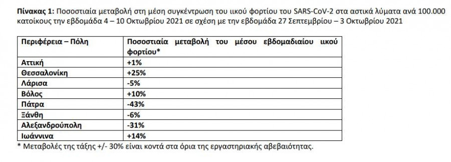Οριακές αυξήσεις παρατηρήθηκαν στα Ιωάννινα (+14%) και στη Θεσσαλονίκη (+25%), ενώ σταθεροποιητικές τάσεις παρατηρήθηκαν στην Ξάνθη (-6%), στη Λάρισα (-5%), στην Περιφέρεια Αττικής (+1%) και στο Βόλο (+10%). Οριακή μείωση (- 31%) του εβδομαδιαίου ιικού φορτίου των αστικών λυμάτων παρατηρήθηκε στην Αλεξανδρούπολη, ενώ μείωση (-43%) αυτού παρατηρήθηκε στην Πάτρα.