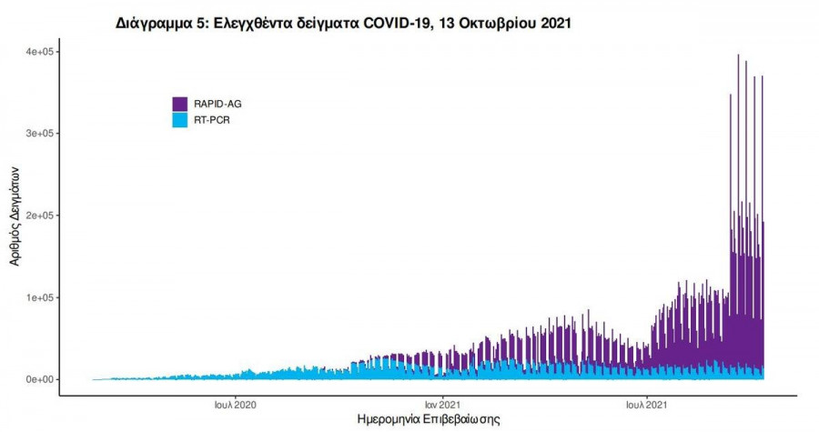 Από την 1η Ιανουαρίου 2020 μέχρι σήμερα, στα εργαστήρια που διενεργούν ελέγχους για τον νέο κορωνοϊό (SARS-CoV-2) και που δηλώνουν συστηματικά το σύνολο των δειγμάτων που ελέγχουν, έχουν συνολικά ελεγχθεί 6.785.328 κλινικά δείγματα ενώ από Μονάδες Υγείας και Κλιμάκια του ΕΟΔΥ που διενεργούν ελέγχους Rapid Ag έχουν ελεγχθεί 15.841.230 δείγματα. O μέσος όρος του επταημέρου είναι 185.700 δειγματοληπτικοί έλεγχοι.