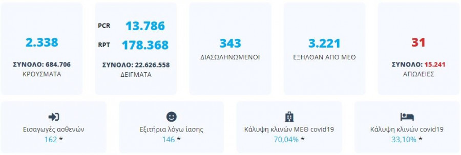 Κρούσματα σήμερα: 2.338 νέα ανακοίνωσε ο ΕΟΔΥ - 31 θάνατοι σε 24 ώρες, στους 343 οι διασωληνωμένοι