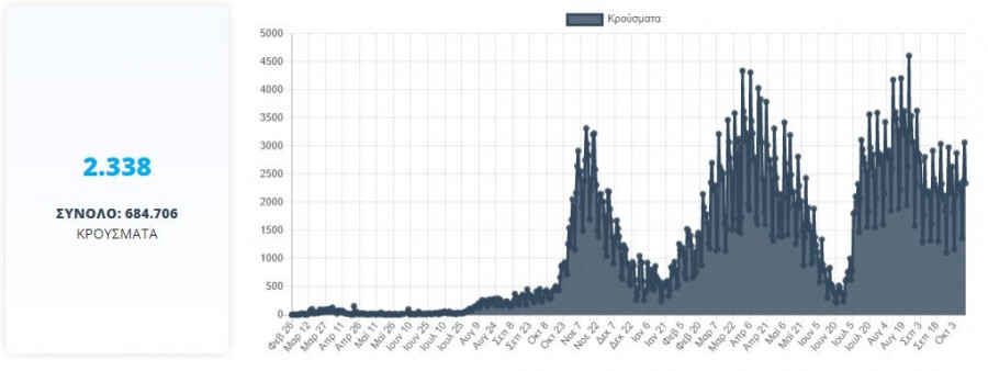 Σε σταθερά υψηλά επίπεδα κυμαίνονται κρούσματα καθώς ο ΕΟΔΥ την Τετάρτη (13.10) ανακοίνωσε 2.338 νέα, ενώ επιβεβαιώθηκαν δυστυχώς ακόμα 31 θάνατοι και 343 συμπολίτες μας νοσηλεύονται διασωληνωμένοι.