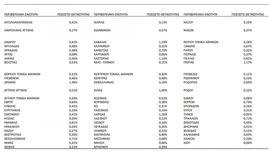 Συγκεκριμένα, το υψηλότερο ποσοστό ανάμεσα στις περιοχές εντοπίζεται στην Δράμα με θετικότητα 1,36% και ακολουθεί η Καβάλα με 1,19%.