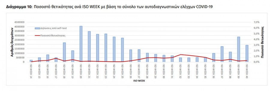 Συγκεκριμένα, όπως σημειώνεται στην ενημέρωση, την προηγούμενη εβδομάδα, το ποσοστό θετικότητας ήταν 1.17% σε σύνολο 1.303.844 εργαστηριακών ελέγχων (RT-PCR/Rapid-Ag) και 0.25% σε σύνολο 1.911.382 αυτοδιαγνωστικών ελέγχων. Στο σύνολο των ελέγχων, το ποσοστό θετικότητας ήταν 0.48%.