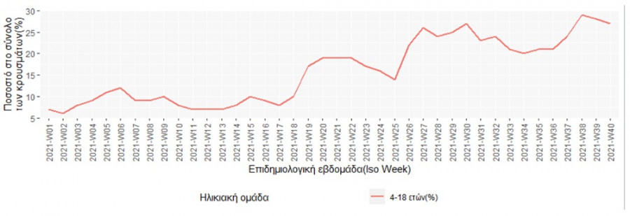Κορονοϊός: Την εβδομάδα 4-10 Οκτωβρίου, το σύνολο των ασθενών με covid-19, ηλικίας 4-18 ετών, είναι 4.135, αποτελώντας το 27% (-3,57% από την προηγούμενη εβδομάδα) στο σύνολο των κρουσμάτων κορονοϊού.