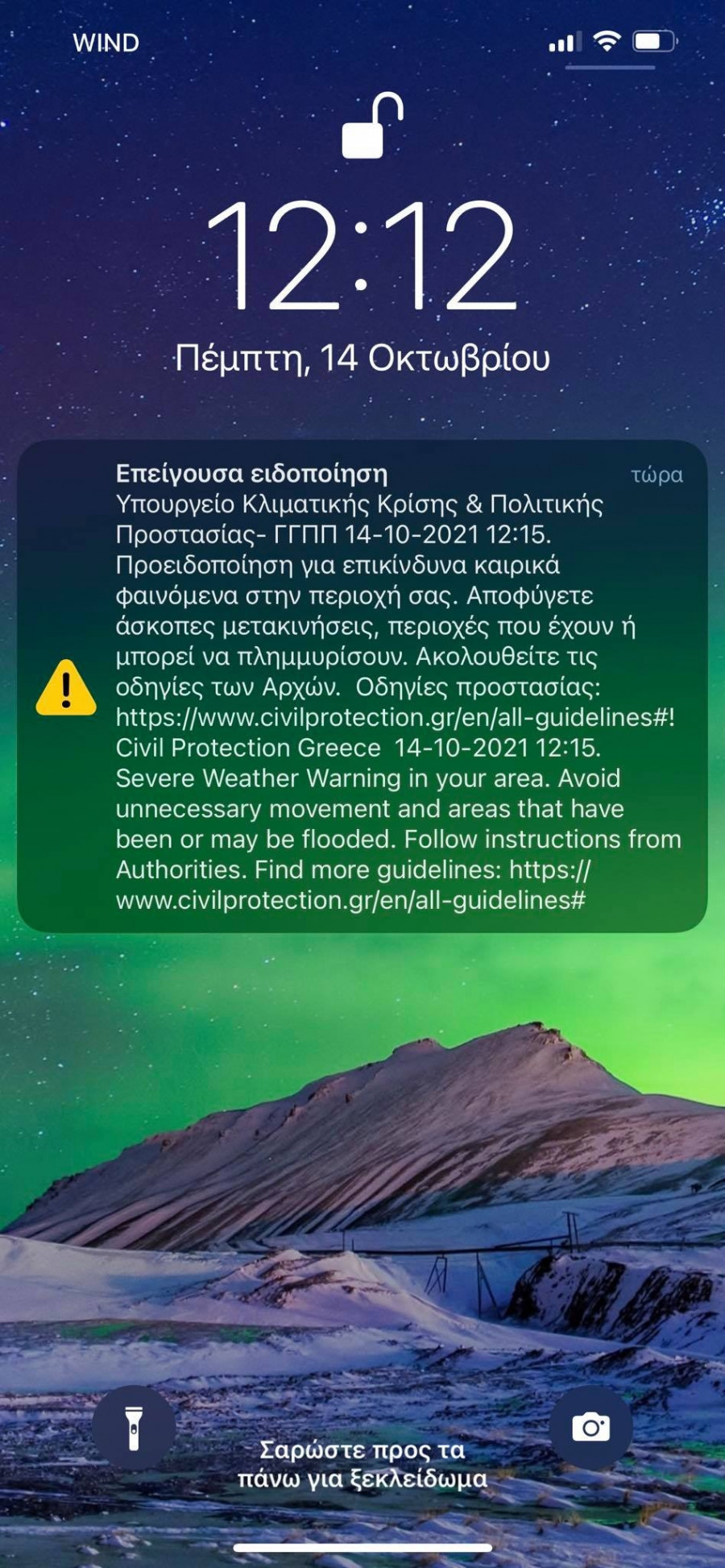 Μήνυμα από το 112 και στην Αττική στάλθηκε λίγο μετά τις 12 το μεσημέρι. Όπως αναφέρει το μήνυμα: Προειδοποίηση για επικίνδυνα καιρικά φαινόμενα στην περιοχή σας. Αποφύγετε άσκοπες μετακινήσεις, περιοχές που έχουν ή μπορεί να πλημμυρίσουν.