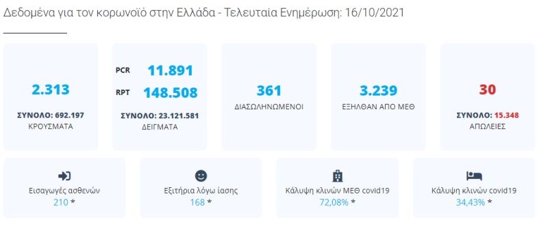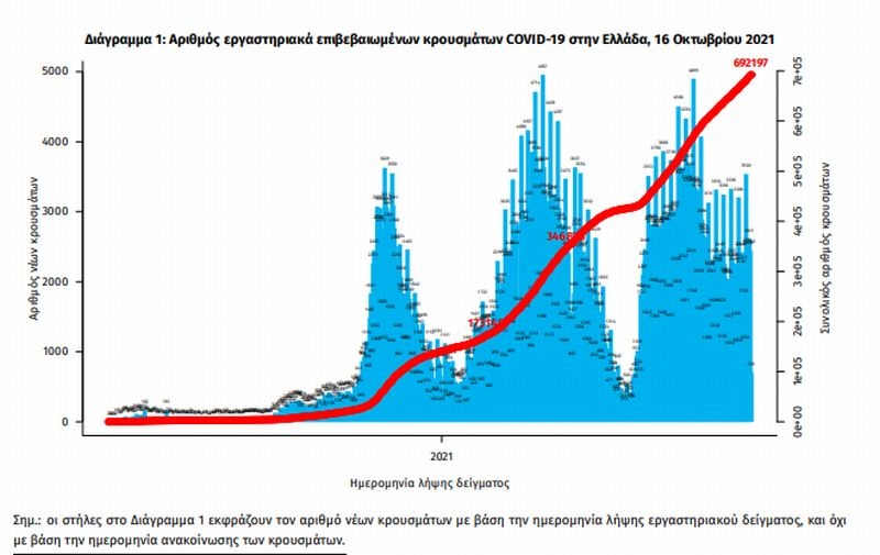 Τα στοιχεία που παρουσιάζονται αφορούν περιστατικά από την επιδημιολογική επιτήρηση της νόσου από το νέο κορονοϊό (COVID19), με βάση τα δεδομένα που έχουν δηλωθεί στον ΕΟΔΥ και καταγραφεί μέχρι τις 16 Οκτωβρίου 2021 (ώρα 15:00).