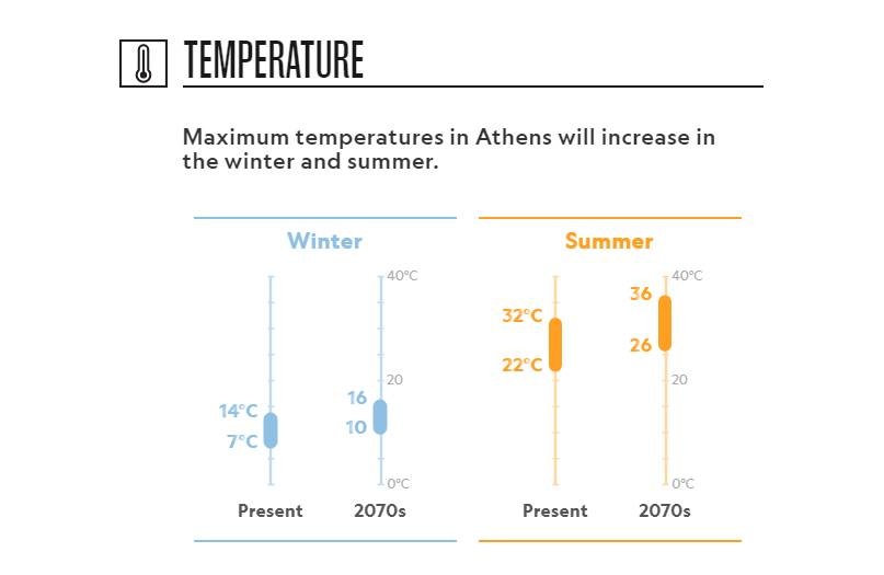 Η μέση θερμοκρασία της θα σημειώσει αύξηση της τάξης των τριών βαθμών στη διάρκεια του χειμώνα και των έξι βαθμών (!) στη διάρκεια του καλοκαιριού, με τις ημέρες καύσωνα. Κάτι που σε απλά μαθηματικά σημαίνει 46 βαθμούς!