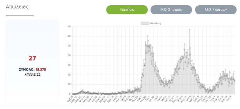Οι νέοι θάνατοι ασθενών με COVID-19 είναι 27, ενώ από την έναρξη της επιδημίας έχουν καταγραφεί συνολικά 15.375 θάνατοι.