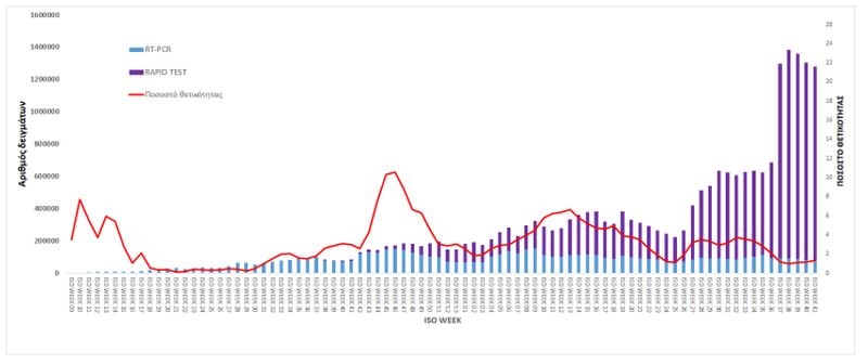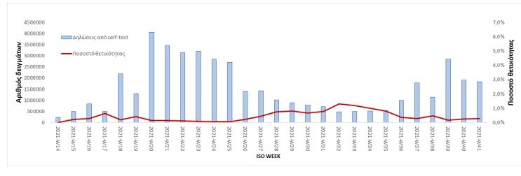 Σε ό,τι αφορά το ποσοστό θετικότητας στη χώρα, σύμφωνα με τον ΕΟΔΥ αυτό ήταν 1,35% στους εργαστηριακούς ελέγχους (PCR και Rapid Test), οι οποίοι έφτασαν στο 1.280.617 την εβδομάδα αναφοράς, ενώ έφτασε στο 0,28% σε 1.831.175 self-tests. Στο σύνολο των ελέγχων, η θετικότητα έφτασε στο 0,68%.
