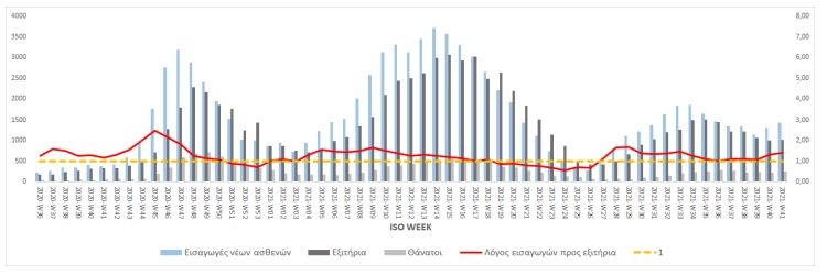 Την εβδομάδα αναφοράς, οι εισαγωγές νέων ασθενών ήταν 1.427, ενώ το σύνολο των εξιτηρίων λόγω ίασης ήταν 1.014. O λόγος εισαγωγών νέων ασθενών προς εξιτήρια λόγω ίασης ήταν 1.41.