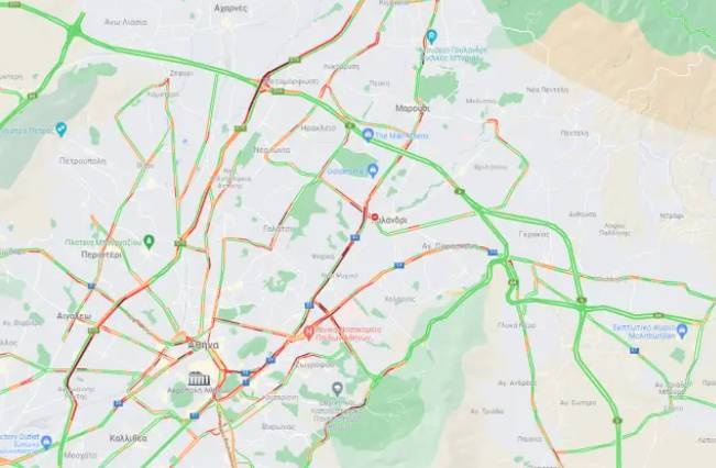 Σύμφωνα με την εικόνα από τον χάρτη της Google για την κίνηση, μποτιλιάρισμα επικρατεί σε αρκετούς δρόμους της Αττικής.