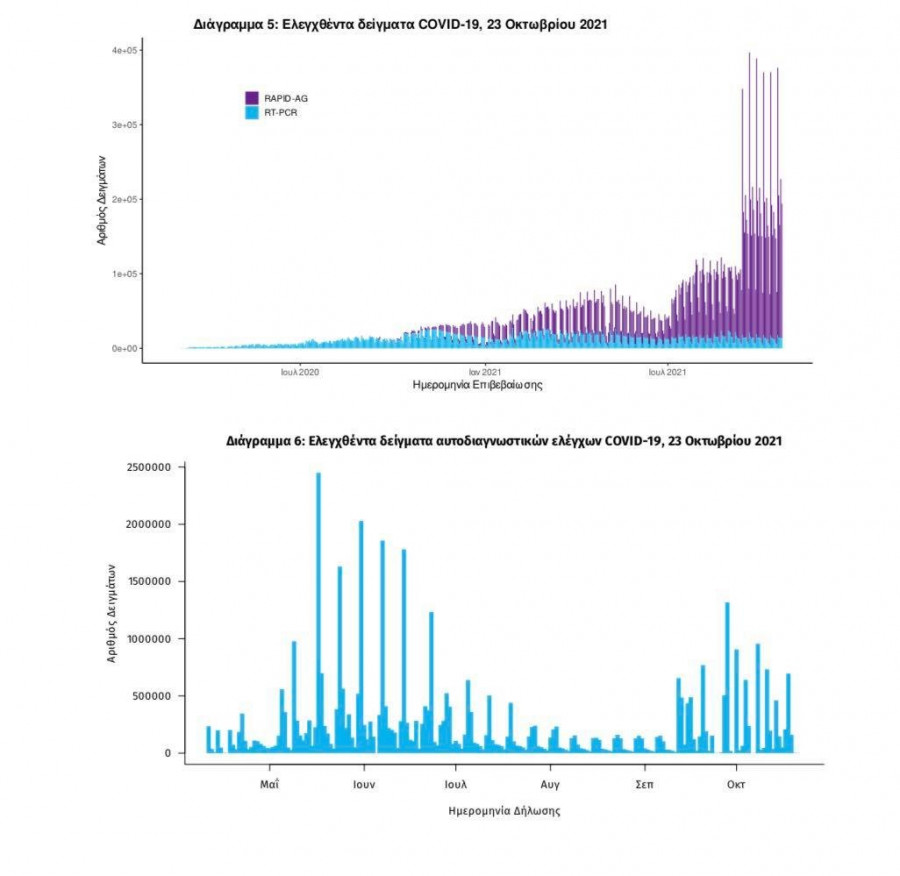 ενώ από Μονάδες Υγείας και Κλιμάκια του ΕΟΔΥ που διενεργούν ελέγχους Rapid Ag έχουν ελεγχθεί 17.602.849 δείγματα. O μέσος όρος του επταημέρου είναι 198.686 δειγματοληπτικοί έλεγχοι.