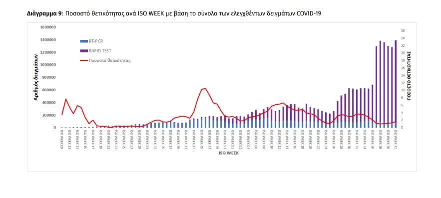 Σύμφωνα με τον ΕΟΔΥ, την ίδια εβδομάδα το ποσοστό θετικότητας ήταν 1.61% σε σύνολο 1.393.526 εργαστηριακών ελέγχων (RT-PCR/Rapid-Ag) και 0.36% σεσύνολο 1.831.691 αυτοδιαγνωστικών ελέγχων.