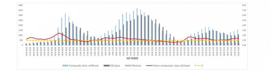 Την εβδομάδα αναφοράς, οι εισαγωγές νέων ασθενών ήταν 1.586, ενώ το σύνολο των εξιτηρίων λόγω ίασης ήταν 1.109.