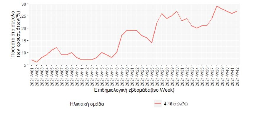 Την εβδομάδα αναφοράς, το σύνολο των ασθενών ηλικίας 4-18 ετών είναι 5.970, αποτελώντας το 27% (+3.8% από την προηγούμενη εβδομάδα) στο σύνολο των κρουσμάτων (Iso Week 42).