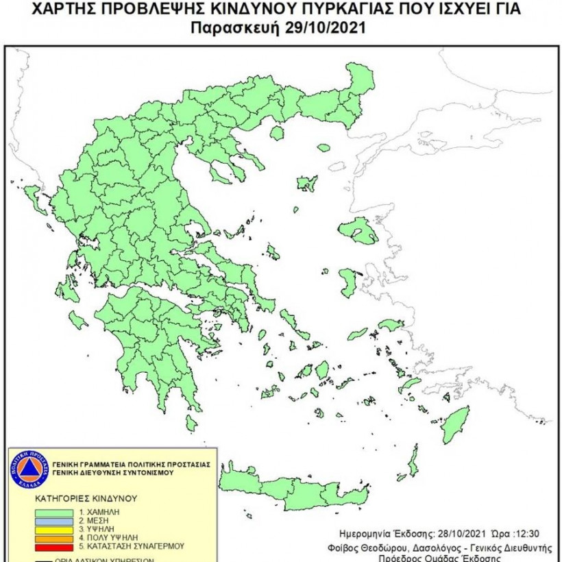 Φωτιές στην Ελλάδα - Όλες οι ειδήσεις: Σύμφωνα με το Χάρτη Πρόβλεψης Κινδύνου Πυρκαγιάς που εκδίδει η Γενική Γραμματεία Πολιτικής Προστασίας του Υπουργείου Εσωτερικών και Διοικητικής Ανασυγκρότησης, για σήμερα Πέμπτη 28η Οκτωβρίου, προβλέπεται χαμηλός κίνδυνος πυρκαγιάς (κατηγορία κινδύνου 1), σε όλη τη χώρα.