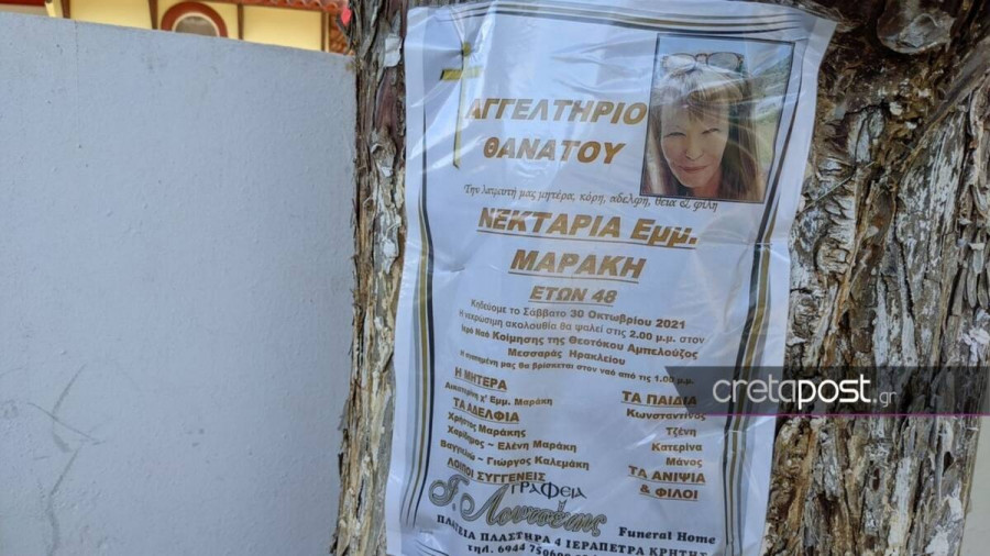 Σήμερα το μεσημέρι τα τέσσερα παιδιά και οι συγγενείς της Νεκταρίας είπαν το τελευταίο αντίο στην 48χρονη, που δολοφονήθηκε από τον πρώην σύζυγό της με 8 μαχαιριές. Λίγο πριν από τη 1 το μεσημέρι η σορός της άτυχης 48χρονης έφτασε στον τόπο της καταγωγής της, στον Αμπελούζο της Μεσαράς, όπου τελέστηκε η κηδεία.