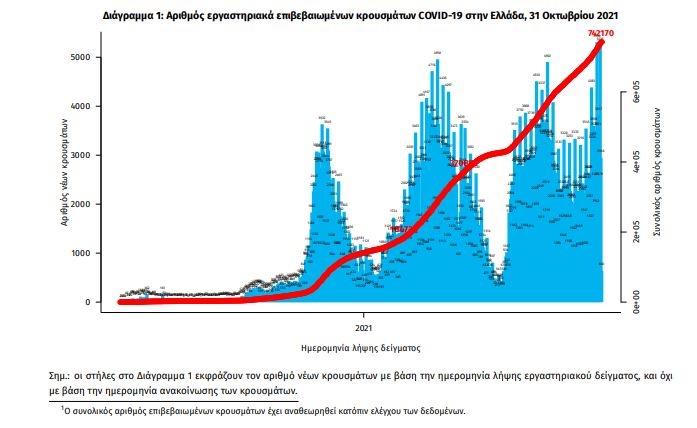 Τα νέα εργαστηριακά επιβεβαιωμένα κρούσματα της νόσου που καταγράφηκαν τις τελευταίες 24 ώρες είναι 2.727 , εκ των οποίων 6 εντοπίστηκαν κατόπιν ελέγχων στις πύλες εισόδου της χώρας. Ο συνολικός αριθμός των κρουσμάτων ανέρχεται σε 742.170 (ημερήσια μεταβολή +0.4%), εκ των οποίων 50.8% άνδρες. Με βάση τα επιβεβαιωμένα κρούσματα των τελευταίων 7 ημερών, 148 θεωρούνται σχετιζόμενα με ταξίδι από το εξωτερικό και 2.855 είναι σχετιζόμενα με ήδη γνωστό κρούσμα.