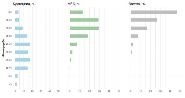 Ακολούθως παρουσιάζεται η ηλικιακή κατανομή των (α) συνολικών κρουσμάτων, (β) των περιστατικών που κατέληξαν σε θάνατο και (γ) των ασθενών που νοσηλεύονται διασωληνωμένοι: