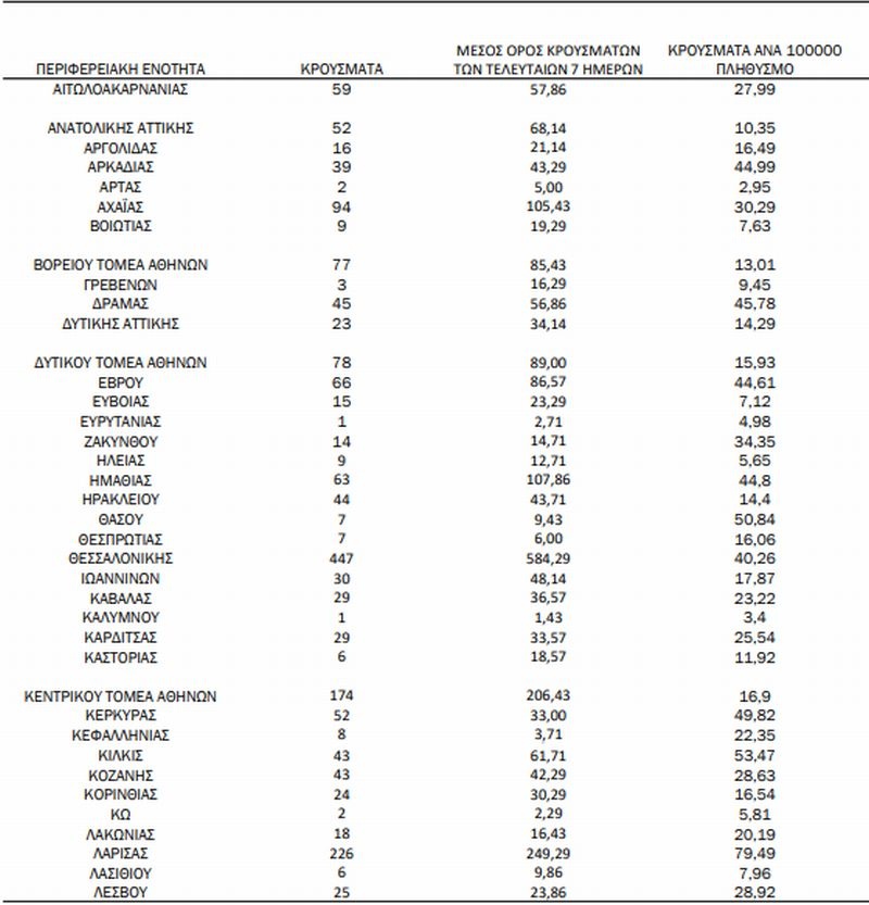 Η κατανομή των κρουσμάτων ανά περιφερειακή ενότητα
