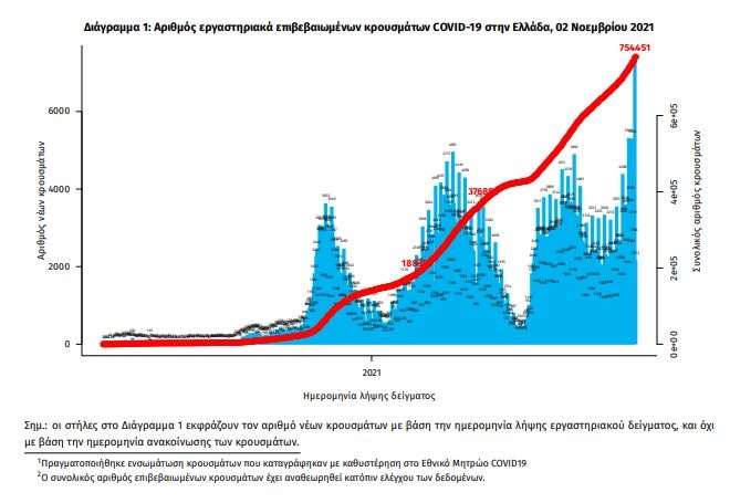 Τα νέα εργαστηριακά επιβεβαιωμένα κρούσματα της νόσου που καταγράφηκαν τις τελευταίες 24 ώρες είναι 6.700, εκ των οποίων 16 εντοπίστηκαν κατόπιν ελέγχων στις πύλες εισόδου της χώρας. Ο συνολικός αριθμός των κρουσμάτων ανέρχεται σε 754.451 (ημερήσια μεταβολή +0.9%), εκ των οποίων 50.8% άνδρες. Με βάση τα επιβεβαιωμένα κρούσματα των τελευταίων 7 ημερών, 143 θεωρούνται σχετιζόμενα με ταξίδι από το εξωτερικό και 2.568 είναι σχετιζόμενα με ήδη γνωστό κρούσμα.