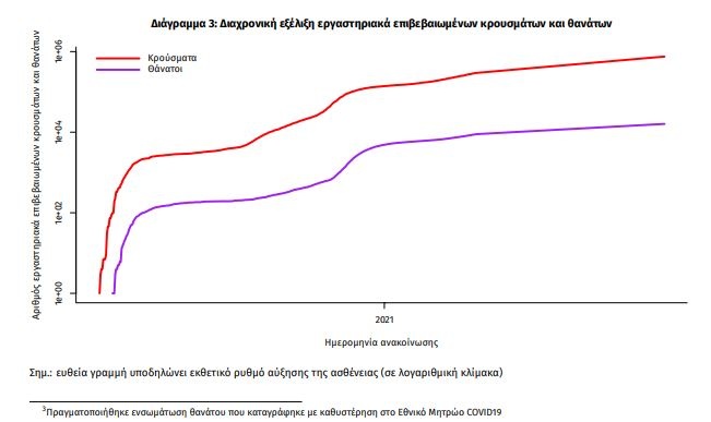 Η διαχρονική εξέλιξη των συνολικών κρουσμάτων και συνολικού αριθμού των θανάτων ασθενών COVID-19 παρουσιάζεται στο ακόλουθο διάγραμμα.