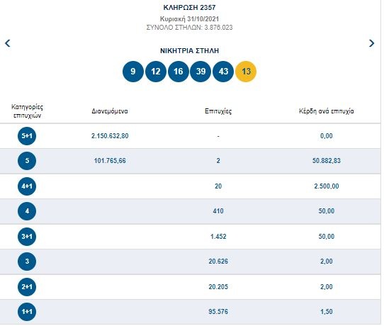 Υπενθυμίζεται ότι οι τυχεροί αριθμοί που έβγαλε η κληρωτίδα της περασμένης κλήρωσης ήταν οι:9, 12, 16, 39, 43 και Τζόκερ ο αριθμός 13.