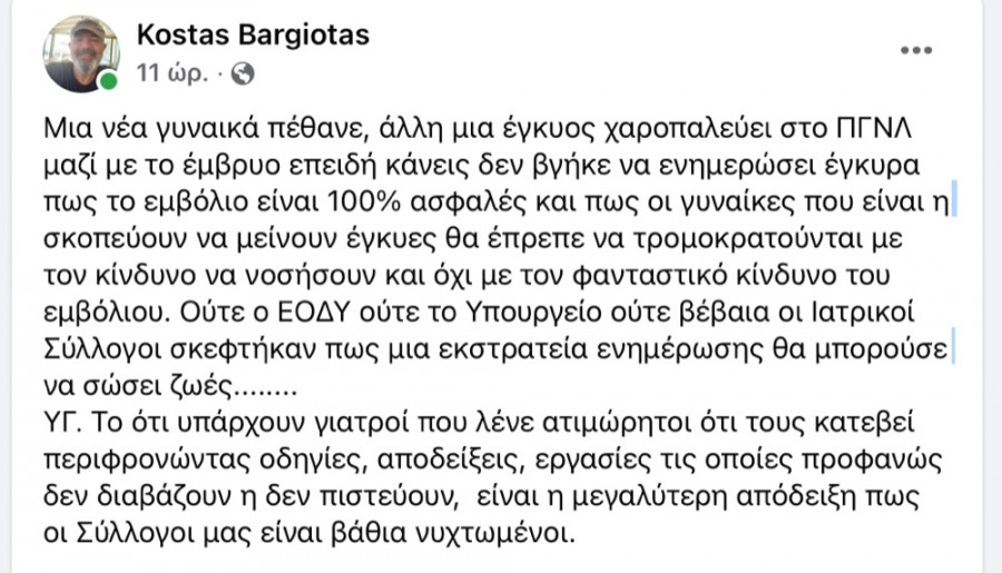 Δείτε την ανάρτηση του κ. Μπαργιώτα: «Μια νέα γυναικά πέθανε, άλλη μια έγκυος χαροπαλεύει στο ΠΓΝΛ μαζί με το έμβρυο επειδή κάνεις δεν βγήκε να ενημερώσει έγκυρα πως το εμβόλιο είναι 100% ασφαλές και πως οι γυναίκες που είναι η σκοπεύουν να μείνουν έγκυες θα έπρεπε να τρομοκρατούνται με τον κίνδυνο να νοσήσουν και όχι με τον φανταστικό κίνδυνο του εμβολίου. Ούτε ο ΕΟΔΥ ούτε το Υπουργείο ούτε βέβαια οι Ιατρικοί Σύλλογοι σκεφτήκαν πως μια εκστρατεία ενημέρωσης θα μπορούσε να σώσει ζωές……..