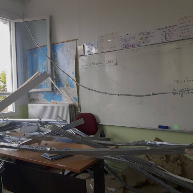 Οι φωτογραφίες από το εσωτερικό της αίθουσας στο δημοτικό σχολείο της Πυλαίας αποτυπώνουν το μέγεθος της καταστροφής και της τραγωδίας που θα μπορούσε να είχε συμβεί αν η δασκάλα, η οποία είναι σε κατάσταση σοκ, δεν είχε πει στα παιδιά να περάσουν έξω.