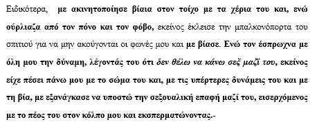«Ενώ ευρισκόμουν στο δωμάτιό μου, εκείνος μπήκε μέσα και κλείδωσε την πόρτα. Του είπα να φύγει και ντύθηκα γρήγορα. Φοβήθηκα τόσο πολύ, ώστε κάθισα στην άκρη του κρεβατιού. Πρώτη φορά τρόμαξα τόσο πολύ. Δίχως να καταλάβω πώς, είχε βγάλει ήδη το πέος του έξω και, αυνανιζόμενος, μου έλεγε «να το γλείψω». Εγώ αρνήθηκα και τότε εκείνος, με όλη του τη δύναμη, έπιασε με τα χέρια του το κεφάλι μου και το πίεσε επάνω στο πέος του. Έσφιγγα το στόμα μου, προσπαθώντας να μην ανοίξω τα χείλη μου, αλλά ο βιαστής μου, ασκώντας τόσο μεγάλη πίεση, άνοιξε βίαια τα χείλη μου, ενώ εκείνος είχε γεμίσει με υγρά το πρόσωπό μου. Αντιστεκόμουν σθεναρά, αλλά αυτός μου έλεγε «κάν’ το να τελειώνουμε, δεν έχεις βαρεθεί να λες όχι ?».