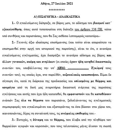 «Τον Απρίλιο του 2014, με το που προσγειώθηκε στην Αθήνα, ο μηνυόμενος μού ζήτησε να βρεθούμε. Άρχισε κατευθείαν να με αγγίζει απότομα στα γεννητικά μου όργανα, καθώς ήμουν ανεβασμένη στο παγκάκι και αυτός έβαζε το χέρι του αρχικά έξω απ το σορτς που φορούσα και, εν συνεχεία, άρχισε να εισχωρεί με το χέρι του μέσα στο αιδοίο μου. Εγώ, από την έκπληξη και την αμηχανία μου, είχα κοκκινήσει, φοβόμουν όμως να του πω να σταματήσει αυτό που έκανε, μήπως με χαρακτηρίσει σπαστικιά. Δεν ήξερα, τότε, τί θα μου συνέβαινε στη συνέχεια».