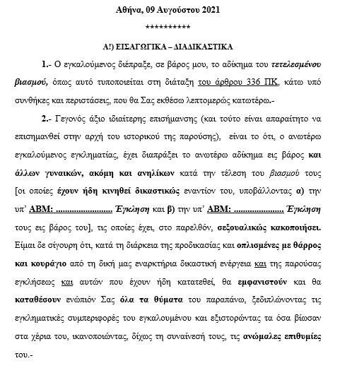 «Τέλη Αυγούστου του 2013 και λίγο πριν τις εισαγωγικές εξετάσεις στην Δραματική Σχολή, μετέβην στην οικία του εγκαλουμένου, περί ώρα 20:00 βραδινή, προκειμένου να κάνουμε ένα ακόμη ακόμα μάθημα. Ενώ αυτό βρισκόταν σε εξέλιξη, ο μηνυόμενος άρχισε να σβήνει σιγά - σιγά τα φώτα του σπιτιού του, μέχρι το σημείο που είχε μείνει ανοιχτό μόνο το φως του χωλ και ήταν αρκετά σκοτεινά, λέγοντας μου να μη διακόπτω τον μονόλογο ό,τι και να κάνει.... (…) Ξαφνικά ο εγκαλούμενος κατέβασε το παντελόνι και το εσώρουχό μου και έβαλε βίαια τα δάχτυλά του μέσα στο αιδοίο μου. Εγώ πόνεσα από την βιαιότητα, πάγωσα από τον τρόμο μου, ενώ εκείνος απαιτούσε επιτακτικά από μένα να μη σταματάω να μιλάω. Όσο πονούσα και έτρεμα, τόσο εκείνος επιτάχυνε την κίνηση των δακτύλων του μέσα στο αιδοίο μου, κρατώντας με στο γραφείο με το χέρι του στην πλάτη μου, ώστε να μην μπορώ να κουνηθώ και να απελευθερωθώ. Εγώ, φυσικά, δεν μπορούσα να απαγγείλλω, είχα παραλύσει από τον φόβο μου, δεν μπορούσα να κουνηθώ εξαιτίας της πίεσης του χεριού του στην πλάτη μου και έβαλα τα κλάματα... Τότε ο εγκαλούμενος, έβγαλε τα δάχτυλά του από το αιδοίο μου, έκατσε στην καρέκλα που βρισκόταν ακριβώς πίσω του και με έβαλε να καθήσω επάνω του με τη βία, κρατώντας με σφιχτά από τα χέρια, ώστε να μην μπορώ να φύγω. Ενώ είχα ξεσπάσει σε λυγμούς, εκείνος μου είπε ότι πρέπει να πάω σε ψυχολόγο για να δουλέψω τη σχέση μου με τον πατέρα μου, γιατί αυτό είναι που με κρατάει πίσω. Μετά από λίγο και αφού συνέχιζε να μου λέει διάφορες ψευδοεπιστημονικές «ψυχολογικές» ανοησίες, άφησε επιτέλους τα χέρια του από πάνω μου, με απελευθέρωσε και έτσι κατάφερα να απομακρυνθώ... Μη μπορώντας να συνέλθω, ζήτησα να σταματήσουμε το μάθημα και έφυγα τρέχοντας από το σπίτι του, σταματώντας τα (κατ’ ευφημισμόν μόνο) «μαθήματά» μας» καταλήγει.
