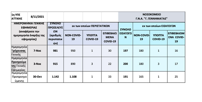 «Αναφορικά με δηλώσεις της Προέδρου της ΕΙΝΑΠ ως προς τις εφημερίες στις 7-8/11/2021, διευκρινίζεται ότι το σύνολο των εισαγωγών Covid/ non Covid περιστατικών παρουσιάζει σταθερότητα, συγκριτικά με την προηγούμενη ημερομηνία εφημέρευσης, ενώ ειδικά τα περιστατικά Covid εμφανίζονται μειωμένα (16 έναντι 25 στις 30/10/2021).
