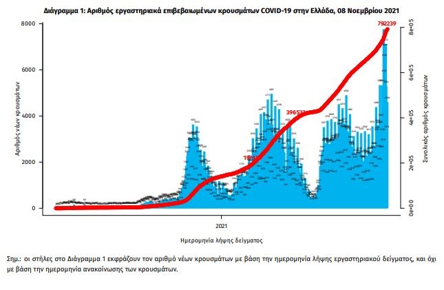 Τα νέα εργαστηριακά επιβεβαιωμένα κρούσματα της νόσου που καταγράφηκαν τις τελευταίες 24 ώρες είναι 7.335, εκ των οποίων 17 εντοπίστηκαν κατόπιν ελέγχων στις πύλες εισόδου της χώρας. Ο συνολικός αριθμός των κρουσμάτων ανέρχεται σε 792.239 (ημερήσια μεταβολή +0.9%), εκ των οποίων 50.7% άνδρες. Με βάση τα επιβεβαιωμένα κρούσματα των τελευταίων 7 ημερών, 146 θεωρούνται σχετιζόμενα με ταξίδι από το εξωτερικό και 2.542 είναι σχετιζόμενα με ήδη γνωστό κρούσμα.