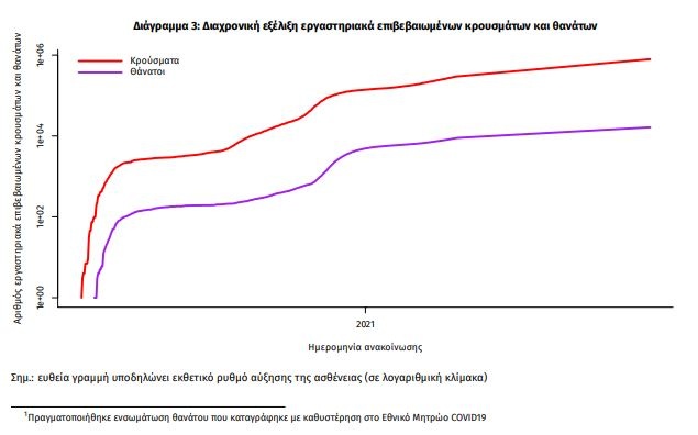 Η διαχρονική εξέλιξη των συνολικών κρουσμάτων και συνολικού αριθμού των θανάτων ασθενών COVID-19 παρουσιάζεται στο ακόλουθο διάγραμμα.