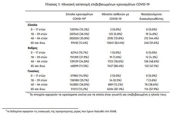 Οι νέοι θάνατοι ασθενών με COVID-19 είναι 65, ενώ από την έναρξη της επιδημίας έχουν καταγραφεί συνολικά 16.361 θάνατοι. Το 95.3% είχε υποκείμενο νόσημα ή/και ηλικία 70 ετών και άνω.