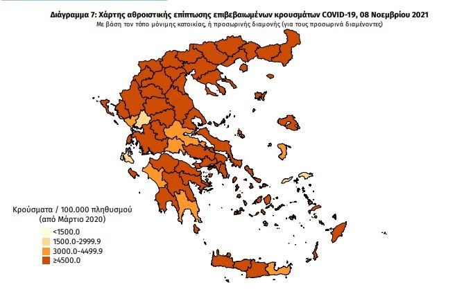 Πίνακας 2: Ημερήσιος αριθμός και κρούσματα ανά 100.000 πληθυσμού επιβεβαιωμένων εγχώριων κρουσμάτων COVID-19 ανά περιφερειακή ενότητα στις 08 Νοεμβρίου 2021.