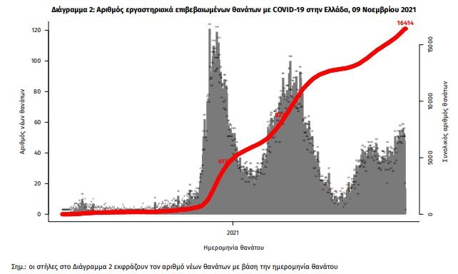 Οι νέοι θάνατοι ασθενών με COVID-19 είναι 46, ενώ από την έναρξη της επιδημίας έχουν καταγραφεί συνολικά 16.414 θάνατοι. Το 95.3% είχε υποκείμενο νόσημα ή/και ηλικία 70 ετών και άνω.